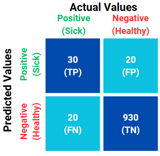 Let's say we have a dataset consisting of 95% healthy individuals and only 5% sick individuals, as mentioned earlier. The dataset contains 1,000 people, and we have built a model to make predictions. The confusion matrix for the model’s prediction scenario is shown in Figure 4.